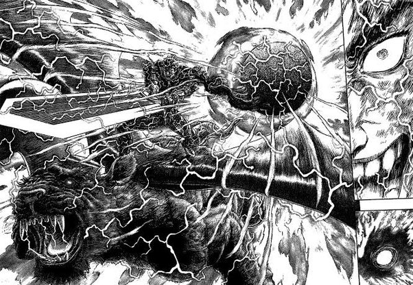 Despite a successful rescue while fleeing to Midland's borders, the Hawks learn Griffith became physically incapable to lead them as they, Casca, and Guts determine how to proceed. When Griffith regains his Behelit while injuring himself during a solar eclipse, the pendant uses his blood to establish a temporary convergence of the physical world and the supernatural astral realm in the form of a hellscape. The Hawks encounter a quartet of archdemons known as the "Godhand" who have gathered for a ritual known as the Eclipse, revealing that Griffith has been chosen to become their final member and can only transcend his humanity if he offers his comrades as sacrificial offerings. Griffith accepts once reminded of the person he has always been. The Hawks are branded with demonic sigils, marking them for sacrifice and are subsequently slaughtered by the Godhand's Apostles—humans like Zodd who attained power by sacrificing their loved ones and humanity. Only Guts and Casca survive the massacre, but Griffith's first act as the being Femto is to rape Casca in front of Guts, with an enraged Guts losing his left forearm and right eye in his attempt to save her. They are rescued by the Skull Knight, but the ordeal traumatizes Casca enough to regress her mind to a childlike state. Guts learns from the Skull Knight that their "Brands of Sacrifice" makes them targets for specters and other beings of darkness on a nightly basis. Guts leaves Casca in the care of the blacksmith Godo, his adoptive daughter Erica, and Rickert, the last and youngest member of the Band of the Hawk, who survived by not being present at the Eclipse. Godo outfits Guts with a giant new sword, "Dragonslayer", and a prosthetic left arm with a built-in cannon and crossbow. Guts begins hunting down the Apostles to find and kill Griffith while followed by a demonic phantom called the Demon Child, which is actually Guts' and Casca's unborn child deformed by Femto's rape.
